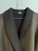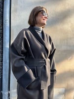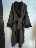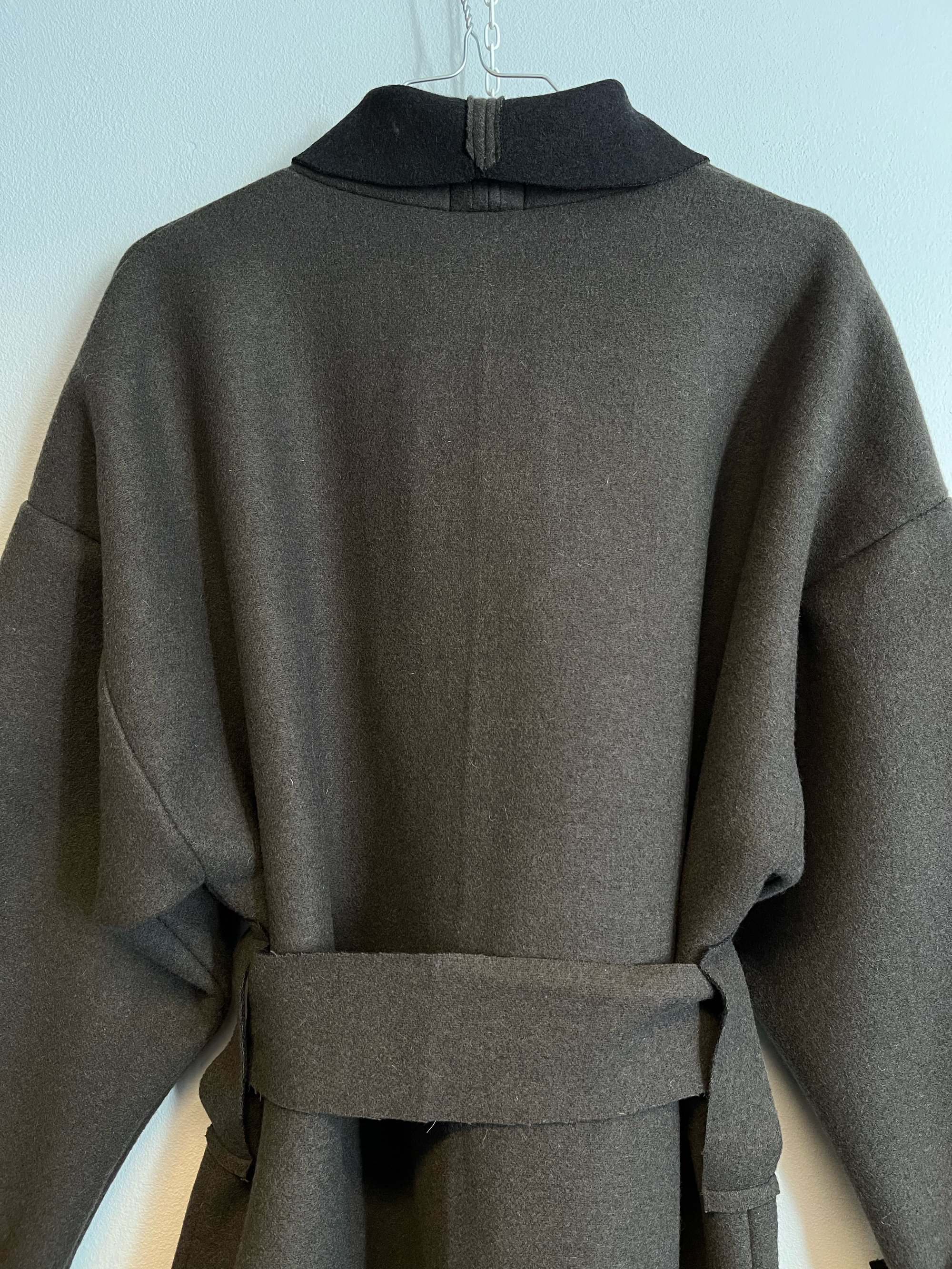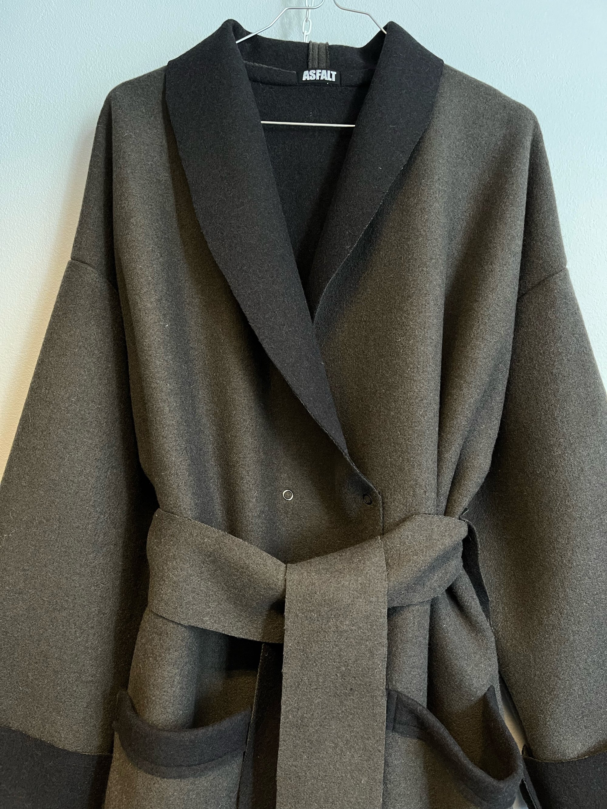 Lang sort uldfrakke syet i kimonosnit med bred sjalskrave.