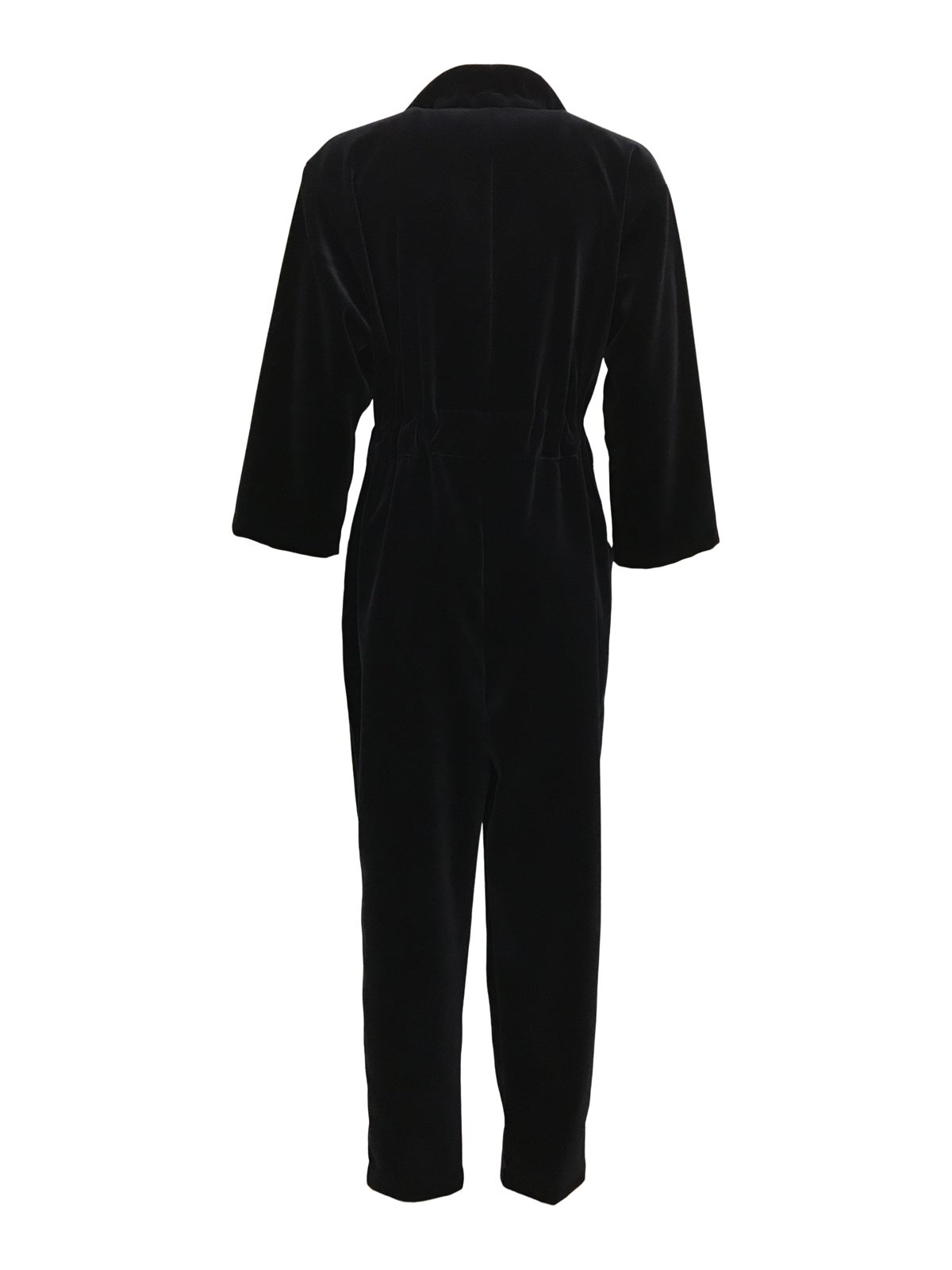 Buksedragt med sjalskrave, store lommer og bredt læg i ryggen. Justerbar elastik i taljen.