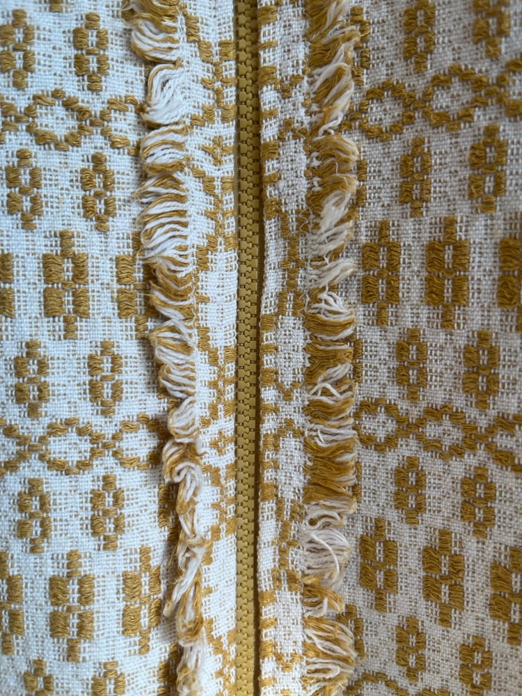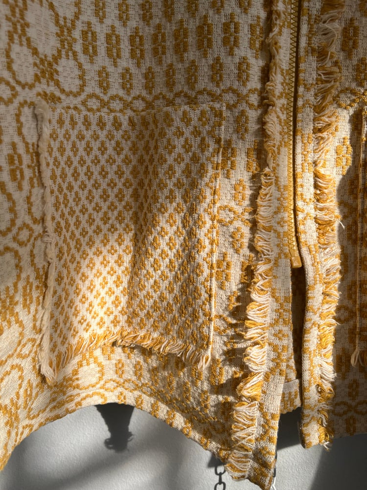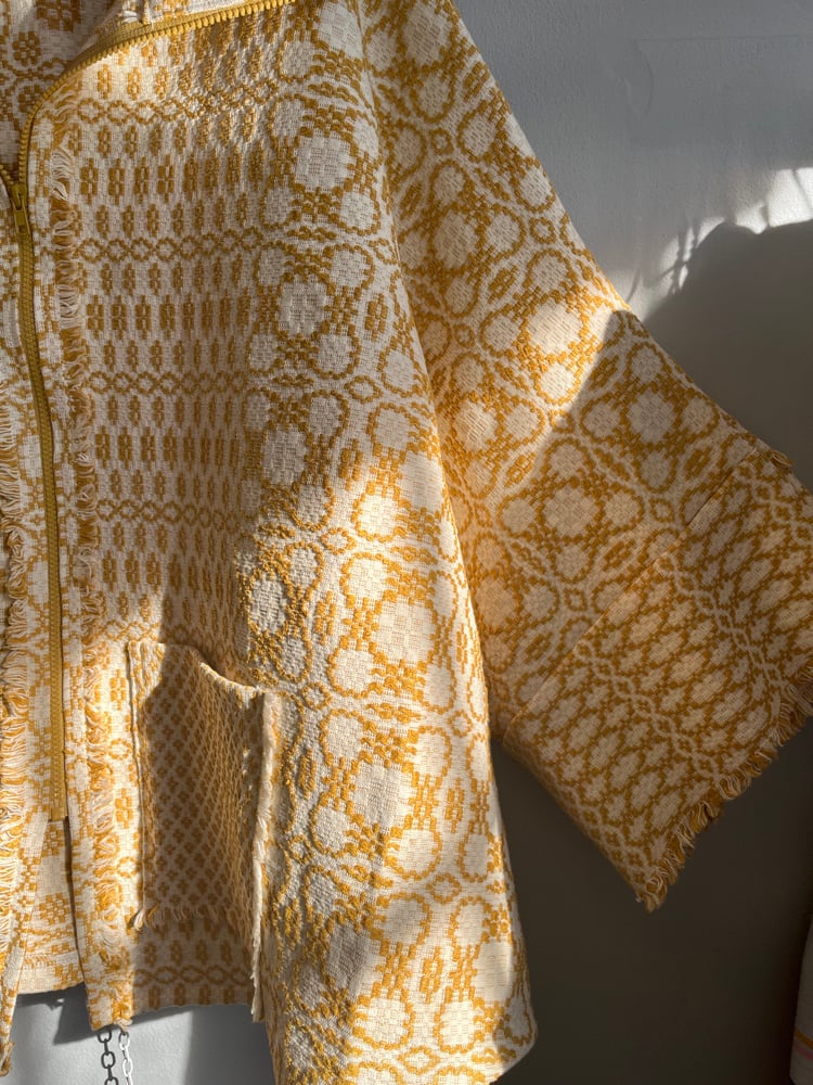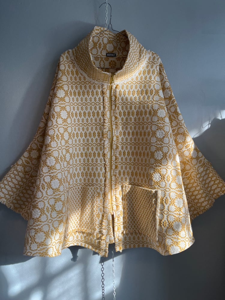 Fantastisk poncho jakke syet i kraftig vævet dug i gul og hvid.